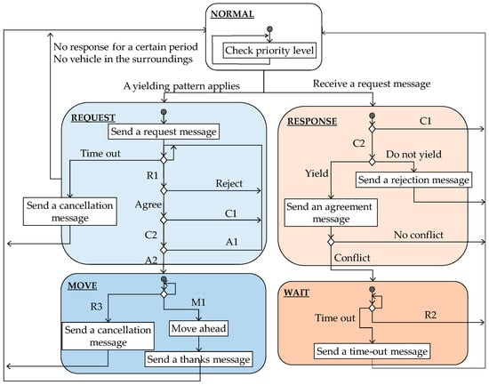 A vehicle that has received a yielding request decides whether to yield the way based on its speed, moving direction, and information about the surroundings captured by its sensors. The criteria used to make this decision depend on the particular yielding pattern. The former method considered several criteria, such as whether there is a traffic light, whether the vehicle can stop safely, how the vehicle ahead behaves, how many low-priority vehicles are queuing up, and whether there is a vehicle in the back. To enhance yielding efficiency, this paper additionally considers whether there is a conflict situation, whether there are pedestrians wanting to cross a road, whether there is enough space to move into, and what is the priority level of the road the own vehicle is running, as shown in Figure 4. Here, the space to move into means space on the target lane that the low-priority vehicle will move into when the responding vehicle has yielded the way. The driver in a human-driven vehicle sends an agreement message through a UI, as shown in Figure 1, but does not send an agreement message if there is no conflict situation.