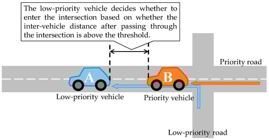 The low-priority vehicle decides whether to enter the intersection based on how far it will be from the priority vehicle in the back after it has passed through the intersection, as shown in Figure 6. The value we set to the inter-vehicle distance threshold was such that the priority vehicle does not need to brake even when the low-priority vehicle moves into a position in front of it. The inter-vehicle distance thresholds for the two types of vehicle were as follows:
