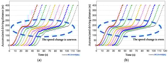 Or by varying the inter-vehicle distance or the maximum rate of acceleration. Self-driven vehicles were designed such that they change the speed smoothly and drive efficiently with no time wasted in deciding whether to go into the intersection. In contrast, human-driven vehicles were designed to have some delay in recognizing the situation of the road ahead and drive less efficiently. Differences in parameters set between the two types of vehicle are shown in Table 5. We set the response time of human-driven vehicles by referring to the response time reported in [], and the maximum rate of deceleration of self-driven vehicles by referring to the maximum rate of deceleration that was reported not to give anxiety to the passengers in [].