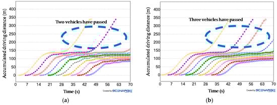 Impact on the vehicle in the back after the low-priority vehicle has stopped at, and then passed through, the intersection. (a) Human-driven vehicle; (b) self-driven vehicle.