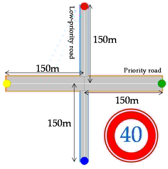 Reference [] deals with an intersection where there is a roadside unit but no traffic light and no road prioritization. Reference [] focuses on a T-shaped intersection where there is a roadside unit, but no traffic light and priority is assigned to each road. References [,] consider an intersection with no traffic light or roadside unit and no road prioritization. This paper addresses an intersection where there is no traffic light or roadside unit, and priority is defined on each road.