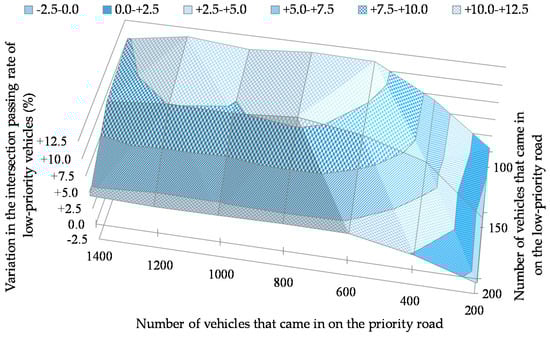As shown in Figure 10, the intersection passing rate of low-priority vehicles improved in all situations except for the case where the number of vehicles coming in on the priority road was 200, and the number of vehicles coming in on the low-priority road was between 100 and 200. The improvement was prominent in cases where the number of vehicles coming in on the priority road was large, and the number of vehicles coming in on the low-priority road was small. The intersection passing rate improved by 11.28% in the case where 1200 vehicles came in on the priority road and 100 vehicles came in on the low-priority road. As shown in Figure 11, the intersection passing rate improved by 7.80% in the case where the percentage of self-driven vehicles was 60%.