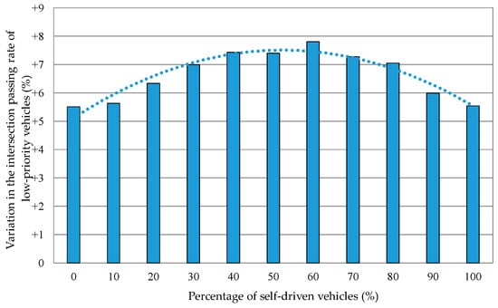 Variation in the intersection passing rate of low-priority vehicles when the percentage of self-driven vehicles was varied. The intersection passing rate was the average for all the vehicles that came in.