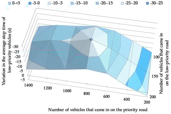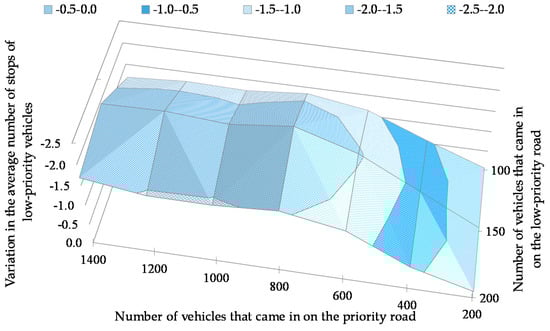 As shown in Figure 12, the average number of stops of low-priority vehicles improved in all situations. The improvement was prominent when the number of vehicles coming in on the priority road was large. The average number was reduced by 2.00 when 800 vehicles came in on the priority road, and 150 vehicles came in on the low-priority road. The proposed yielding protocol was the most effective when the percentage of self-driven vehicles was 30%, as shown in Figure 13. The number of stops was reduced by an average of 1.56.
