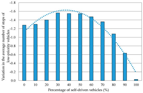 Variation in the average number of stops of low-priority vehicles when the percentage of self-driven vehicles was varied. The average number of stops was the average for all the vehicles that came in.