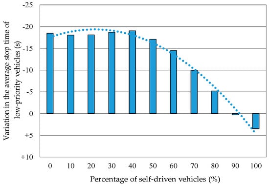 Variation in the average stop time of low-priority vehicles when the percentage of self-driven vehicles was varied. The average stop time was the average for all the vehicles that came in.