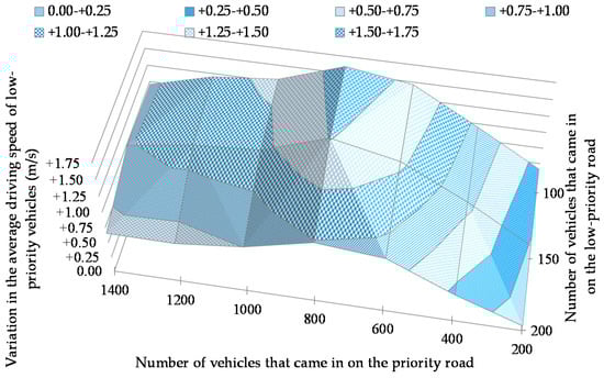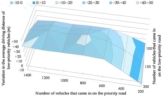 As shown in Figure 16, the average driving distance of low-priority vehicles shows improvement in all situations except for cases where 200 vehicles came in on the priority road, and 100 to 200 vehicles came in on the low-priority road. The improvement is marked in cases where both the number of vehicles that came in on the priority road and that of vehicles that came in on the low-priority road were large. The driving distance increased by an average of 41.00 m when 1400 vehicles came in on the priority road, and 200 vehicles came in on the low-priority road. As shown in Figure 17, the average driving distance was the longest when the percentage of self-driven vehicles was 60%. It was extended by an average of 30.86 m.