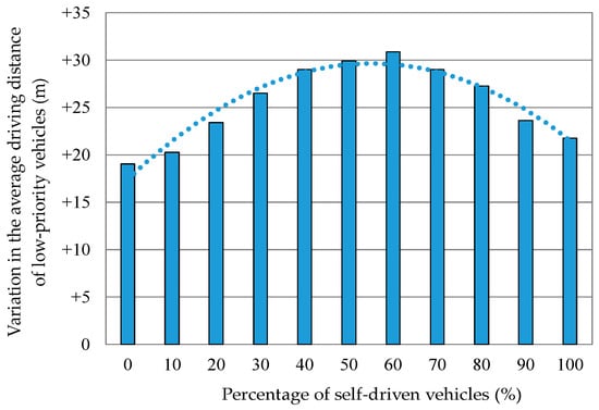 Variation in the average driving distance of low-priority vehicles when the percentage of self-driven vehicles was varied. The average driving distance was the average for all the vehicles that came in.