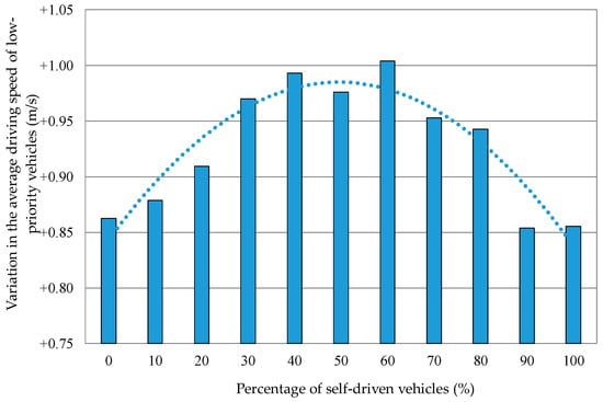 Variation in the average driving speed of low-priority vehicles when the percentage of self-driven vehicles was varied. The average driving speed was the average for all the vehicles that came in.
