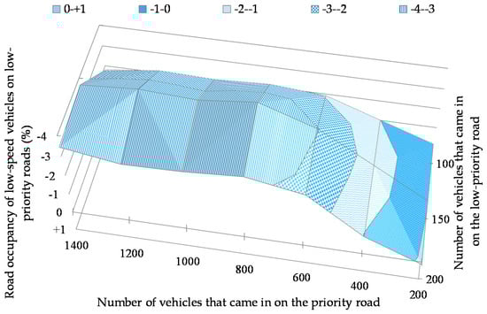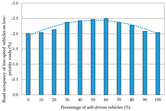 As shown in Figure 20, the road occupancy of low-speed vehicles on the low-priority road improved in all situations except for cases where 200 vehicles came in on the priority road, and 200 vehicles came in on the low-priority road. It improved more when the number of vehicles coming in on the priority road was larger. It was reduced by 3.95% when 800 vehicles came in on the priority road, and 150 vehicles came in on the low-priority road. As shown in Figure 21, it was the lowest when the percentage of self-driven vehicles was 60%. It was reduced by 2.50%.