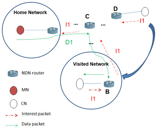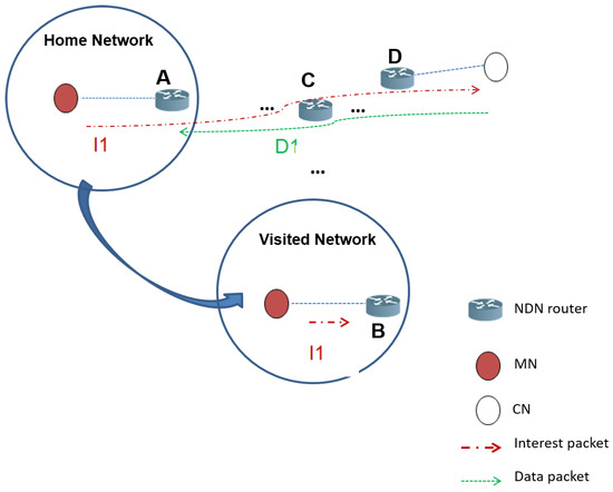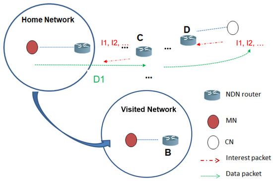 home network. A, B, C and D represent routers. As ICN is receiver-oriented, data transmission for this example starts when the consumer entity expresses interest on a specific content, i.e., MN sends an Interest packet