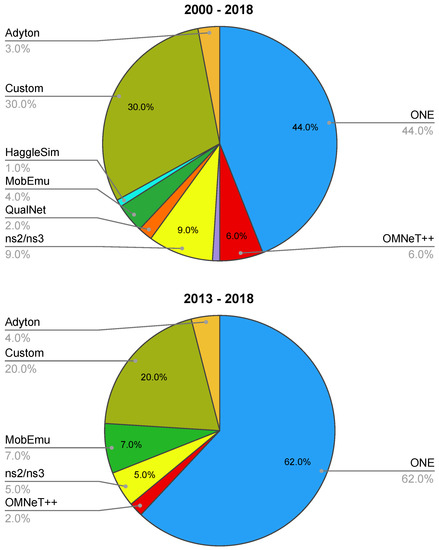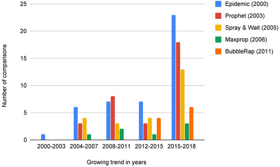 Thus, researchers often opt for a tradeoff, where they compare their new protocols against available and well explored ones. In the case of OppNets, these protocols are typically Epidemic, ProPhet, Spray & Wait, MaxProp and BubbleRap, as shown in Figure 4. It can be seen clearly in Figure 4 that the most widely used protocols for comparison are Epidemic, Prophet, Spray & Wait, Maxprop and BubbleRap and this trend stays the same even in the recent studies during 2015–2018. We also present these results extensively in Figure A1 in Appendix A, where we have marked all protocols which have been used for comparison from other protocols. For example, the SEPR protocol from 2003 (Line 3 in the figure) has been compared against Epidemic. It can be clearly seen that freely available implementations of protocols (marked blue in the figure) are preferred options to compare against. Furthermore, the matrix in Figure A1 gets “thinner” towards the right bottom corner, while it should be actually filled under its diagonal.