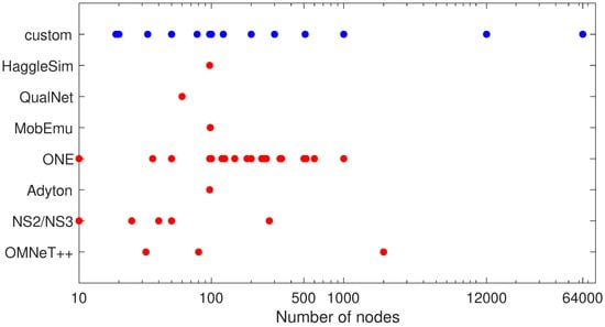 Simulation scale for different simulation environments, for all papers in our surveys which declare the number of nodes.