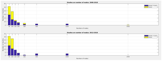 Scalability in OppNets is directly related to the network size, i.e., the number of nodes in the network. The network size considered in the studied protocols is represented in Figure 3 and Figure 5. Most of the studies have been evaluated for a network size of fewer than 100 nodes. Very few evaluations have considered more than 200 nodes and the trend declines rapidly for 500 nodes, 1000 nodes and above. In one of the studies (Fresh [12]), the network size ranged 1000–64,000 nodes. In studies where mobility traces were used (see also the discussion in the next Section 7), the network size was limited by the number of nodes in the traces.