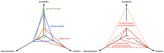 The properties of the three families of mobility models are also summarized in Figure 6 (left). Figure 6 shows how different mobility models vary in degrees of their relevance in terms of generalization, realism and scalability. For instance, a single trace is highly realistic, although neither highly scalable nor relevant in terms of generalization, as it adheres to a specific scenario. Until recently, the models have been used exclusively, i.e., only one model was applied in a particular simulation. However, other approaches are also possible: running simulations with several mobility models separately and together. The first idea is quite straightforward: a simulation is run first with mobility Model A, then with Model B, Model C, etc. All results together are used to derive the performance of the explored protocol.