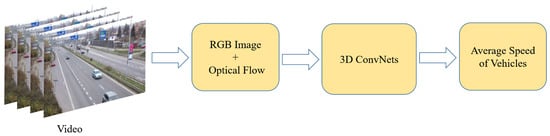 Optical flow is the observed motion pattern of objects, surfaces, and edges in a visual scene caused by relative motion between an observer and a scene [,]. It can also be defined as apparent velocity of brightness patterns in an image. As optical flow reflects the velocity of pixel points, and the velocity of a vehicle is closely related to that of all the pixel points comprising the vehicle, optical flow information is a logical and useful additional input to our model.