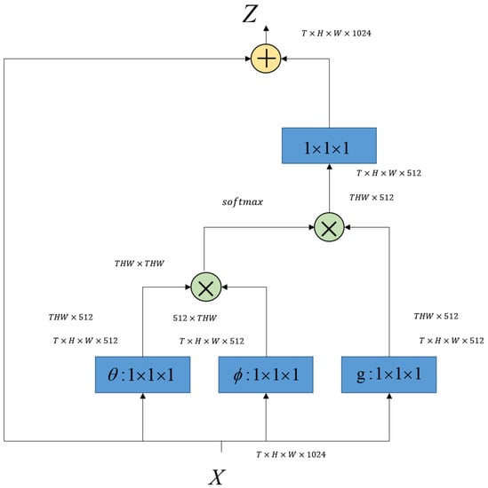 We include the non-local block in our model to capture more vehicle spatial-temporal features from video footage, as shown in Figure 3. X is the input tensor and Z is the output tensor. refers to the dimensions of the input tensor X. ’⊗’ represents the matrix multiplication, and ’⊕’ stands for the element-wise sum. The blue rectangle indicates a convolution. Details of the specific implementation are presented in Section 4.