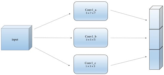 One simple observation is that a vehicle closer to the camera appears larger that one of the same actual size yet further from the camera. Put differently, the vehicle size on camera is not necessarily in proportion with its actual size. With our goal of estimating vehicle speed in mind, it is important to consider the differences of vehicle size on camera due to their different distances from the camera. Different distances from the camera give rise to different scales for vehicles, which makes determining the size of convolution kernel difficult. Our way of tackling this issue is to input the convolution kernels of different sizes to the first layers separately of the network, of which the outputs are concatenated to be the inputs of the next layer. The information with different scales is considered in multiple convolution kernels, making the network adaptive. Figure 4 shows our multi-scale CNN. The box on the left indicates the input of the model. The three boxes in the middle respectively represent the three different convolutional layers of convolutional kernels as , and . The large cuboid on the right represents that the resulting concatenated output, which is used as the input of the next layer.