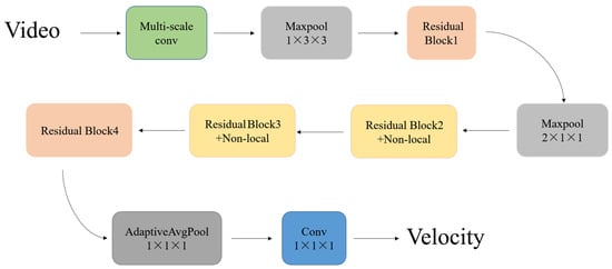 It is known that the convolutional neural network is mainly concerned with local information. However, the vehicle speed estimation problem requires consideration of the vehicle trajectory change throughout the entire video footage. In order to focus on more global information, we add non-local blocks to the second and third residual blocks of the network. Besides, we add a convolutional layer whose kernel is (3, 5, 5), the stride is (1, 2, 2) after the first convolutional layer to reduce video memory. Moreover, we also change the first layer of the ConvNet to the multi-scale convolution detailed in Section 3.3.