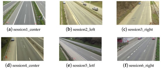 The dataset used is adapted from the BrnoCompSpeed Datase [], which is a new benchmark dataset including 18 full-HD traffic monitoring videos. The traffic videos in this dataset were filmed in six different locations with three cameras (Panasonic HDC-SD90, Sony Handycam HDR-PJ410, Panasonic HC-X920) from different angles in each site. Each camera recorded an approximate a one hour-long video. The frame rate of the videos is 50 FPS, while the resolution is 1080p. The 20,865 vehicles recorded in the videos have been accurately annotated by LIDAR and verified by several reference GPS tracks. The videos in BrnoCompSpeed Dataset cover all typical traffic surveillance cameras angles and various traffic situations (small traffic flow in Session 3, large traffic flow in Sessions 5 and 6). Figure 6 is the sample images taken by six cameras in BrnoComSpeed Dataset. To show the environment clearly, we intentionally select the pictures with carless lanes.