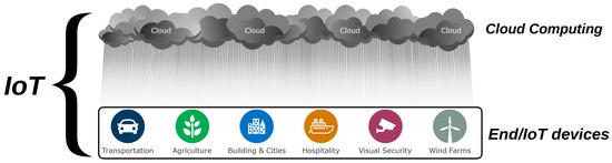 For this reason, we think that it is no longer enough to consider Cloud computing and IoT as two different entities, but we need to change the perspective, especially when looking at how to protect IoT systems. Similarly to other works in the literature, such as [17,18,19,20], we assume a picture of IoT in which Cloud computing and end devices are the two tight layers constituting a broader Internet of Things. In this new setting, IoT cannot disregard Cloud computing, as the Cloud is a core component of the overall IoT architecture, rather than an external entity. Note that the viceversa is not true, as the Cloud was not originally thought for IoT devices and it has been widely studied as a stand-alone paradigm.