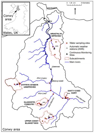 We focus on one specific geographic region around Conwy in North Wales (see Figure 1), a typical rural area supporting important industries including agriculture, forestry, tourism, and fishing but facing huge challenges brought about by climate change and conflicting demands on land/water resources. The Conwy river rises in the Snowdonia National Park in the Migneint range which has high rainfall providing water resources and important carbon storage and biodiversity in peatland habitats. The Conwy flows through intensive agricultural land out to an estuary important for the shellfish industry, conservation, and tourism. The lower Conwy was recently in the national news due to intensive flooding of several larger towns. Such extreme events are consistent with climate change predictions. The major shellfisheries and tourist beaches close to the Conwy estuary are continually subject to contamination, to risk of closure, or to loss of blue flag status due to microbial pollution from rural wastewater treatment plants and agricultural runoff. These pollution events are becoming increasingly frequent and are also exacerbated by floods, storms in general, and periods of drought.