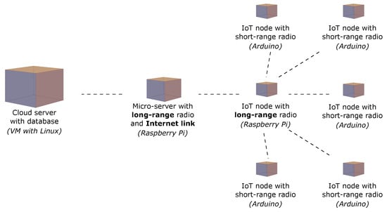 Our resulting architecture is shown in Figure 2. In the field, we use a micro-server as an Internet gateway (a Raspberry Pi) which is situated at a location with plentiful energy, either from a mains supply or from a large battery. This device is fitted with an Internet link technology, in our case 3G, as well as a long-range radio to communicate with the rest of the IoT deployment in the field. Our remaining IoT devices are then deployed into the actual field of study, which may be several kilometres away from the Raspberry Pi. One of these IoT devices () is itself equipped with a long-range radio and communicates with the Raspberry Pi; the remaining IoT devices have short-range radios and communicate only with . This design has two major benefits: (i) the use of a separate Internet link node, which can be at a distant location, provides high flexibility because a wide area coverage (i.e., 3G) may be sporadic or nonexistent in the actual area of study, and (ii) the use of just one long-range radio “pair” reduces the cost of the overall deployment, as this higher class of radio is more expensive to buy and also draws more power, needing more expensive energy harvesting and storage technology at . On the cloud side, we then have one main server which receives data from the deployment, storing that data into a database. Other cloud servers (or end users) use web services to extract data from this machine and feed it into models or visualisation systems.