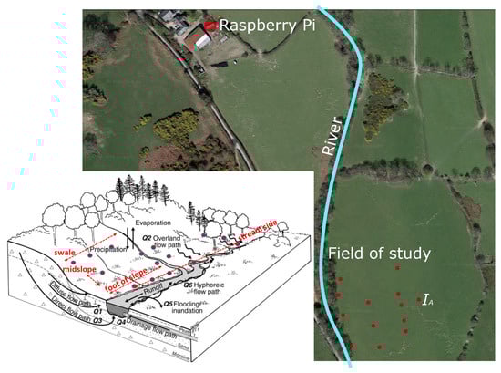 In our particular case study, our system architecture is projected onto the deployment area shown in Figure 3, providing both a geographical view and a detailed hydrology view. The Raspberry Pi is located in a small utility shed offered by a local farmer; our field of study is then 1.5 km away from this location. The terrain between the Pi and the field of study also involves significant elevation changes and dense tree lines. Besides the long-range IoT node, which communicates with the Pi, we then have two types of node deployed in the field: fixed nodes, measuring soil moisture levels, air temperature and humidity, and ground flow, and mobile nodes attached to livestock, measuring animal location and behaviour via GPS and accelerometers. Together, these nodes provide an unprecedented real-time insight into multiple facets of the natural environment and their interrelationships.