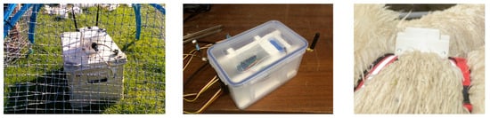 The casing design for the animal tracking nodes was complicated by the fact that they needed to be both weather-proof and physically suitable to the animals without causing irritation. To provide a very close fitting enclosure for our electronics, we 3-D printed the casing and then designed a harness to secure the device to livestock (in this case, sheep). After several trials, we settled on a harness made of soft but durable material which secured the sensor node on the top of the animal’s back. Figure 4 shows the soil node and the animal tracker in their respective enclosures.