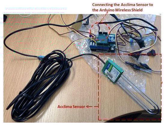 As a high-quality counterpart to these sensors, we used an Acclima soil moisture sensor (Digital TDT SDI-12 (Landscape Technologies, Sydney, Australia)), as shown in Figure 6. This sensor is considered one of the most accurate and stable soil moisture sensors available today. The Acclima sensor is more expensive than the Grove sensors; however, it is a preferred tool used by environmental scientists in order to measure different parameters in the soil. In typical (non-IoT) deployments, an Acclima is attached to a data logger unit and scientists periodically visit the site to download the data from this logger by physically attaching a USB drive. Instead, we connected the Acclima directly to our Arduino board and wrote a simple driver to periodically take readings from it and send them through our IoT to the cloud.
