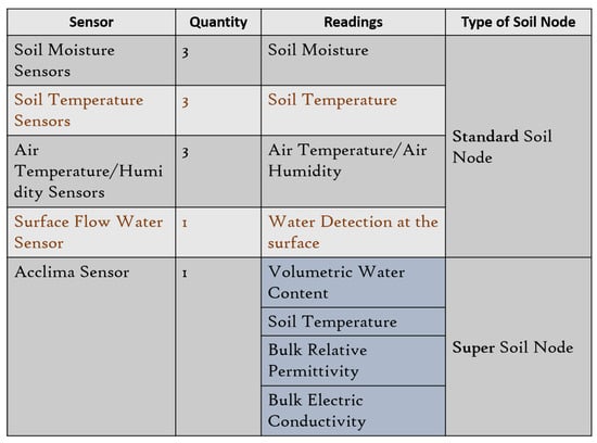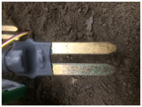 There are two types of soil nodes deployed in this experiment—standard and super soil nodes (stations). The standard soil node consists of the cheap Grove sensors, as shown in Figure 5, whereas the super soil node consists of the Acclima TDT Soil Moisture sensor, as shown in Figure 6 together with the Grove sensors.