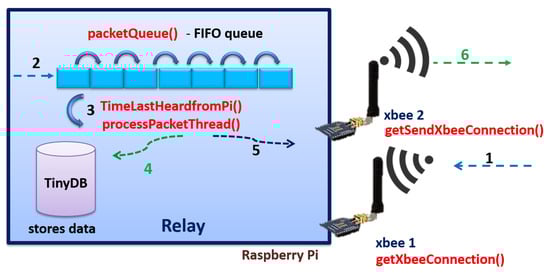 The relay node is equipped with two different radios: a short-range Xbee and a long-range Xbee, each with their own antenna. The first Xbee (Xbee1) is used to receive data from soil/livestock nodes. The second Xbee (Xbee2) is then used to send data from the relay to the gateway. As we were aware that various weather and other local interference effects could disrupt the communication between the relay and the gateway, we implemented a simple store-and-forward system at the relay. Each data packet received by the gateway node from the relay is acknowledged, and any unacknowledged packets are stored locally at the relay node (using a TinyDB database) until their reception is confirmed by the gateway. Figure 8 shows how the relay works. The radio xbee1 (step 1) receives data packets from the sensor network, and these are stored in a queue (step 2) at the relay node. They are then processed in a FIFO (First In First Out) method (step 3), where each data packet is forwarded by the radio xbee2 (steps 5 and 6). If the relay does not receive any acknowledgement from the gateway about a received data packet, then this data gets stored at the TinyDB database (step 4).