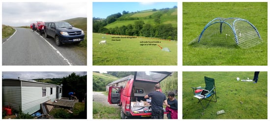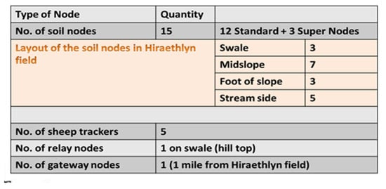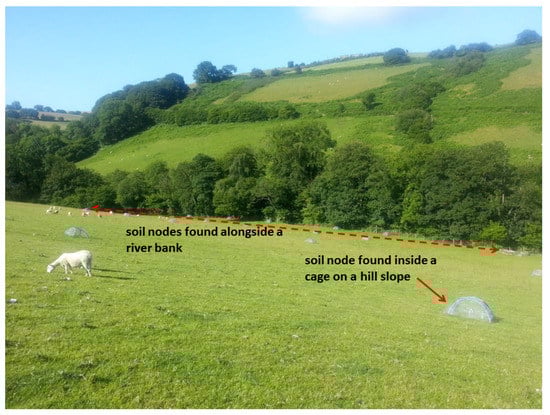 In this section, we report on some of the main deployment and operations stage of the project. Our deployment site is situated in a field in a region called Hiraethlyn, which is found in Conwy, North Wales. Figure 12 shows the number of the nodes in the field, and Figure 3 shows the layout of the soil nodes according to the topology of the field (swale, midslope, and foot of slope). Figure 13 shows the deployment area in Hiraethlyn, which is in a strategic location running alongside a tributary of the Conwy river. The river runs through the Snowdonia National Park in the Migneint range and drifts through intensive agricultural land out to an estuary important for the shellfish industry. A collection of images from this deployment experience is shown in Figure 14. One of the objectives of the IoT experiment is to enable the stakeholders to make informed decisions regarding any possibility of flooding of the Conwy river. The fact that this field slants towards the river tributary is one of the key contributors towards achieving this objective. As shown in Figure 13, the soil nodes are scattered around the Hiraethlyn field and also around the river bank. These soil nodes help to detect the soil moisture content of this field. This value coupled with the met office weather data can help to inform the environmental scientists about any possibility of flooding of the river.