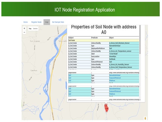 Figure 16 and Figure 17 respectively show the type of data gathered from the soil sensor nodes and the animal trackers. The soil nodes sense the environmental parameters such as soil moisture, soil temperature, humidity, air temperature, etc., whilst the animal tracker reports the location of the animal and accelerometer data. On the other hand, Figure 18 shows an example of a semantic application using the IoT data. The application reports nodes that have been deployed in the field, and upon a click of one such node, it opens up a dialog showing not only the reading at this given node (as shown in Figure 16 and Figure 17) but also the provenance information of this node such as the location, the types of sensors found on this particular node, etc.