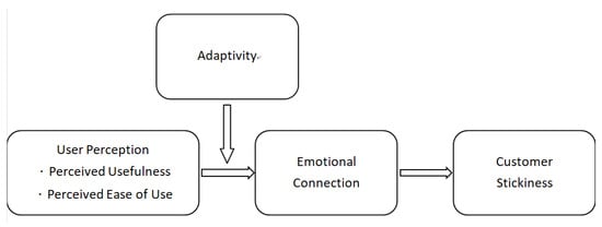 In addition, a firm’s superior performance depends upon the appropriate alignment of its strategic actions with different situations []. Based on this logic, this study proposes the use of adaptivity (system), which enables corporations to adjust themselves for users through obtaining information and facilitating suitable modifications to the user interface []. Adaptivity allows firms with microblogs to effectively and efficiently customize messages that more precisely match products to customer needs, thereby resulting in customer satisfaction and stickiness []. Therefore, another interesting question arises: Does adaptivity affect the mediating effect of emotional connection within the microblogs? Put differently, is the relationship between user perceptions and stickiness through emotional connection contingent on adaptivity?
