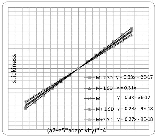 This study further examines how adaptivity moderates the mediating effects of emotional connection on the user perception–stickiness relationship. The statistical results are reported in Table 3, Table 4 and Table 5. In Table 3, Model 3 shows the coefficient estimate of perceived usefulness and perceived ease of use on emotional connection (β = 0.63, p < 0.01 and β = −0.38, p < 0.05), and also that of the product term of independent variables and moderator (β = −0.01, p > 0.05 and β = 0.03, p < 0.05). Model 4 presents the coefficient estimate of emotional connection on stickiness (β = 0.58, p < 0.01). In the moderated mediation model, the interaction coefficient should depart from zero []. Based on this perspective, adaptivity may not moderate the mediating effect of emotional connection from perceived usefulness to stickiness, but adaptivity has a significant indirect effect of perceived ease of use on stickiness through emotional connection. However, merely inspecting the signs and magnitudes of regression coefficients is generally insufficient analysis for moderated mediation hypotheses []. Thus, to gain insight into the moderated mediation process, this study examined the nature of the conditional indirect effects using the procedure suggested by the study []. In Table 4, the procedure tests the significance of regression-coefficient estimates for the relation of perceived usefulness to stickiness via emotional connection at the standard deviation above and below the mean of adaptivity. A significantly positive relationship was found (β = 0.30, p < 0.01) at a mean level of adaptivity. At high levels of adaptivity, the indirect effects of perceived usefulness on stickiness are significantly positive (β = 0.28, p < 0.01 and β = 0.27, p < 0.01 for high and very high levels). At low levels of adaptivity, the indirect effects of perceived usefulness on stickiness are positively significant (β = 0.31, p < 0.01 and β = 0.33, p < 0.01 for low and very low levels). This implies that as adaptivity increases, the indirect effect decreases, but the difference (i.e., β = 0.33 vs. 0.27 for very low vs. very high levels, respectively) in the effect of moderated mediation was not significant (Z = 0.88, p > 0.05). In sum, adaptivity slightly mitigates the mediating effect of emotional connection, and thus, H3 is not supported. Figure 2 shows the effect of moderated mediation (MOME) and illustrates that the slope was not significantly different.