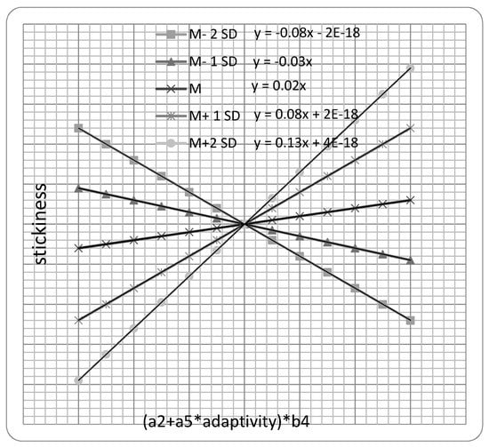Once again, for Hypothesis 4, this study verified the indirect effect of perceived ease of use on stickiness at different values of adaptivity. Table 5 denoted the conditional effect of adaptivity on the mediating effects of emotional connection on the relationship from perceived ease of use to stickiness. This study found that as stickiness increases, the indirect effects increase and are significantly positive at a very high level of adaptivity (β = 0.13, p < 0.05). The results indicated that a high level of adaptivity strengthens the mediating effects of emotional connection. Therefore, adaptivity has positive impacts on the mediating effects of emotional connection, thus supporting H4. Figure 3 presents the effect of this moderated mediation and finds that the slope was significantly different.
