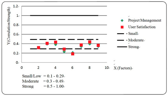 Using the survey data, these predicting variables are used in the multiple regression analysis. The empirical results of the correlation analysis indicate small and moderate relationships between the variables, as shown in Figure 1. There are moderate relationships between independent variables and dependent variables (project management and user satisfaction) in the case of organizational policy and strategic plan (rs = 0.395 and 0.438), technical outsourcing and top management responsibilities (rs = 0.382 and 0.432), change management (rs = 0.392 and 0.407), stakeholder and composition (rs = 0.341 and 0.373), business process innovation and external collaboration factor (rs = 0.343 and 0.364) and organizational commitment and relationship development factors (rs = 0.313 and 0.316). A small relationship exists in the case of project team planning (rs = 0.230 and 0.284) and organizational learning factors (rs = 0.201 and 0.183).
