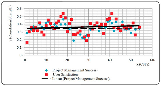 Table 3 shows the multiple stepwise regression analysis results pertaining to user satisfaction as the dependent variable. The value of unstandardized regression coefficient (B), standardized regression coefficient (β) and degree of significance (p-value) of each predictor, df, R, R2, adjusted R2, significance, and Durbin-Watson value for all the predictors in the linear regression analysis for user satisfaction are presented in Table 3. The R2 value is 0.408 indicating 40.8% variance in user satisfaction is explained by the three predicting variables. The F-value for this model is 27.346 and is significant (p < 0.05). The multiple correlation coefficient, R, for this model is 0.639 (R > 0.50), indicating a strong association between the predicting variables and the dependent variable. The R2 value of about 0.37 is considered high according to [68], which indicates that the regression line fits the data set well and that there is a strong linear relationship between the predicting variables and the dependent variable. The Durbin-Watson value of 1.847 indicates that the serial correlation of residual falls within the acceptable range of 1.5 and 2.5, suggesting that the conditions of no autocorrelation problem [56] and observations being independent of predicted values [2,10] are satisfied. Three predicting variables are found to be significant in explaining user satisfaction, which are the reinforcement of the commitment of employees (X1), the establishment of appropriate milestones for the project (X2), and the willingness of the organization to change (X3). As depicted in Table 3, the predicted model generates Equation (2):