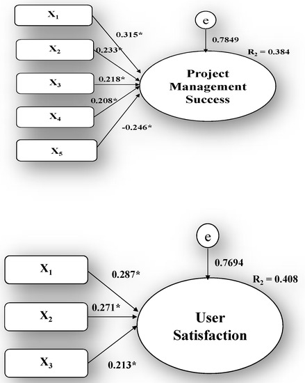 User Satisfaction (Ŷ2) = 1.293 + 0.227 (reinforcement of the commitment of the employees) + 0.247 (establishment of appropriate milestones for the project) + 0.160 (willingness of the organization to change).