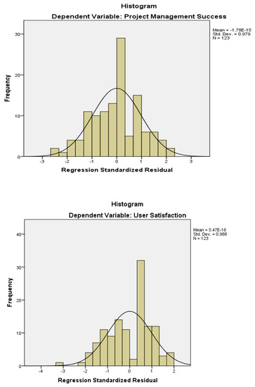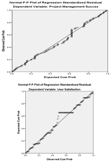 Multiple regression analysis was performed to investigate which predictor from the eight groups of organizational factors contributes the most to e-procurement implementation success. This study involved fifty-two predictors and two dependent variables, i.e., project management and user satisfaction. The eight groups of organizational factors are: (i) organizational commitment and relationship development, (ii) change management, (iii) technical outsourcing and top management responsibilities, (iv) project team planning, (v) organizational learning, (vi) stakeholder and composition, (vii) organizational policy and strategic plan, and (viii) business process innovation and external collaboration. The stepwise multiple regression method relies purely on a mathematical criterion to generate a model that best predicts the outcome variables. It was chosen to get the best model with maximum R2 and standardized beta coefficient. The R2 measures the proportion of the total variance on the dependent variables (e-procurement implementation success). It also explains how well the model fits the dataset. R2 above 0.37 is considered high enough [61]. The coefficient values (standardized beta coefficient) provide insights into how each predictor contributes to the e-procurement implementation success. After completing the multiple regression analysis, the validity of the regression models was tested to ensure that the models satisfy the goodness-of-fit and are appropriate to use as prediction models.
