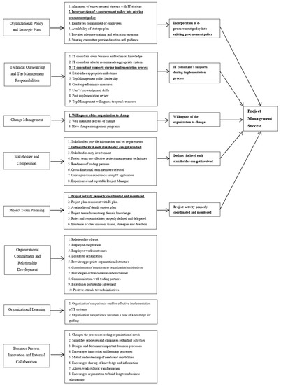 Another study by Mose et al. [44] proposed a conceptual framework for the successful use of e-procurement that includes 20 items in different categories of CSFs as independent variables and e-procurement outcome as the dependent variable. Their study focused on online tender and sourcing involving manufacturing firms and was conducted through surveys. Another study by Arasa and Achuora [74] developed a theoretical model on the factors affecting e-procurement implementation success that consists of 12 items based on TOE (technological, organizational and environmental) as independent variables and the e-procurement impact as the dependent variable. Their focus area was the textile and apparel industry, and data were gathered through surveys. Although there are some similarities between enterprise systems, it is expected that different success frameworks may emerge. As pointed out by Liu [68] and Hartman and Ashrafi [75], a framework of critical success factors that have been identified for a particular project may not apply to another because of differences in environment, types of stakeholders and priority of organizational goals. Therefore, the contribution of this study can be found in a deliberate attempt to formulate the e-procurement implementation success framework for the construction sector where projects characterize businesses.