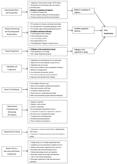 Table 7 shows a comparison of the framework yielded from this study and frameworks generated by other researchers. It clearly shows that frameworks differ in their choice of selection criteria and focus areas. Vaidya et al. [47], for instance, proposed a framework of CSFs for e-procurement implementation success in the public sector by focusing on three (3) primary factors, namely organizational and management, practices and process, and system and technology. Their study was based on a literature survey.