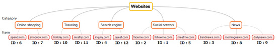Prior to applying the methods, initially we create item categorization for the datasets like in Figure 1. Ideally, items in a database can be categorized based on their characteristics using a prevalent strategy such as “gates-and-experts” method [25]. However, since the datasets contained only item ID, we follow the idea in [26], that is we create an artificial hierarchal item categorization tree. The tree has a root that represents the most general one i.e., website and it contains 50 categories as its leaves where each leave has equally likely the number of items that randomly selected without any overlapping items among categories from .