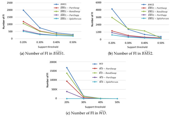 Figure 3 shows that the number of FI from all the anonymized datasets was lower than that of the original one. The decrease in the number of FI in the anonymized datasets mainly due to some items being moved or removed from records, as a result, the structure of records in the anonymized database differs from that of the original one. Since the frequent itemset mining depends on the item sequence, consequently, several itemsets that are considered as frequent itemset in original datasets become no longer frequent in the anonymized datasets and vice versa.