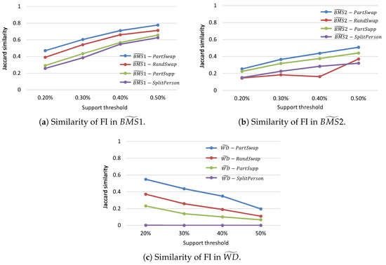 To quantify the amount of preserved data utility, one often uses frequent itemset FI that is the itemset appearing in many records of a database. In this case we count the number of frequent itemsets FI from the anonymized databases resulted by our proposed method and other existing methods, as well as that of the original databases. Since swapping items causes information inaccuracy at the record level, we further investigate the effect of the swapping to the information inaccuracy at the record level by evaluating the similarity of frequent itemset mining results using Equation (2). and refer to the set of FI in the original database and that in the anonymized database , respectively. When the information inaccuracy at the record level is low, the similarity of the mining result is high. Therefore, the higher the similarity is, the better the dataset utility is preserved in the anonymized databases.