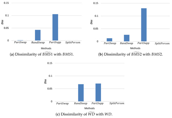 Data dissimilarity represents how far the original datasets have been changed to obtain anonymized datasets. To evaluate dissimilarity , we use the measurement adopted in [22]. In data swapping technique, the data dissimilarity occurs mainly due to item collision in the swapping process. The collision arises when swapped items already exist in the record destination. Figure 5 shows a comparison of values among the anonymized datasets. It represents that our proposed algorithm achieves lower values compared with that of and . Such a result can be obtained due to only swaps items of a category that has the highest item frequency to other items from a different record that has the smallest . Thus, it can avoid a significant number of item loss in and minimize the values. Since does not swap or remove items from datasets, instead, it only splits certain record into several different records the value resulted from the method is always zero. On the other hand, always results in the highest dissimilarity values due to it removes items from the datasets, making the items no longer exist in the anonymized datasets.