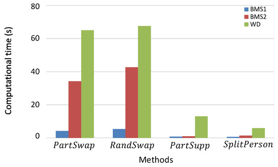 To evaluate the efficiency of our proposed method, we measure computational time for hiding personal tendency. The computational time for has achieved the lowest since the method straightforwardly identifies records in the datasets and split the record containing several personal tendencies into several different records. also requires small computational time due to the method only performs item suppression to the records. On the other hand, to successfully hide the personal tendency takes the longest computational time since it needs to determine random numbers and assigned them to each record prior to performing items swapping. Prominently, our proposed method requires lower computational time than that of since it only needs to calculate value between and each and selects a pair of records that result in the smallest . Therefore, the computation time can be reduced.