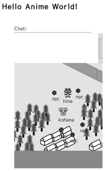 WebRTC is a communication protocol among web browsers. W3C defines the Application Programming Interface(API) specification [], and Internet Engineering Task Force(IETF) standardizes the protocol []. Using WebRTC, web browsers can construct a peer-to-peer network. On this network, the communication does not use a web server as a communication path. Therefore, web browsers can communicate with the other browsers without any backend server. The WebRTC has two channels, the media stream for multimedia data transfer and the data channel for other binary data transfers. In our study, we construct a web browser network using the WebRTC. The client-side software transfers the information via the data channel of WebRTC, while the client exchanges the information via a web server in traditional web-based computer games. In our system, the web server provides static information such as the character images, world images, and the sounds. Each client-side software program manages dynamic information, which is the position of its own avatar. Subsequently, the client sends information about the avatar and the text message via the data channel of WebRTC. Using this method, the client shares the dynamic information without any communication with the web server.