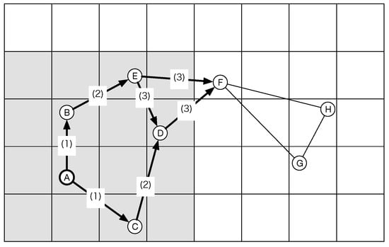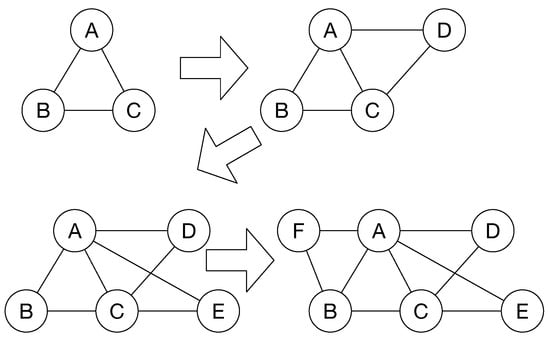 Figure 2 shows an example of network construction based on the BA model. In this figure, the value  is 3, and the number m is 2. In this case, the value  is the number of connections. The three nodes construct a complete graph. When node D joins the network, the probability of each node is 2/3. Therefore, node D choose two nodes and connects to these nodes. After that, node E joins the network and also chooses two nodes with a higher probability. However, the new node might connect to the lower probability node. For example, node F connects to node B.
